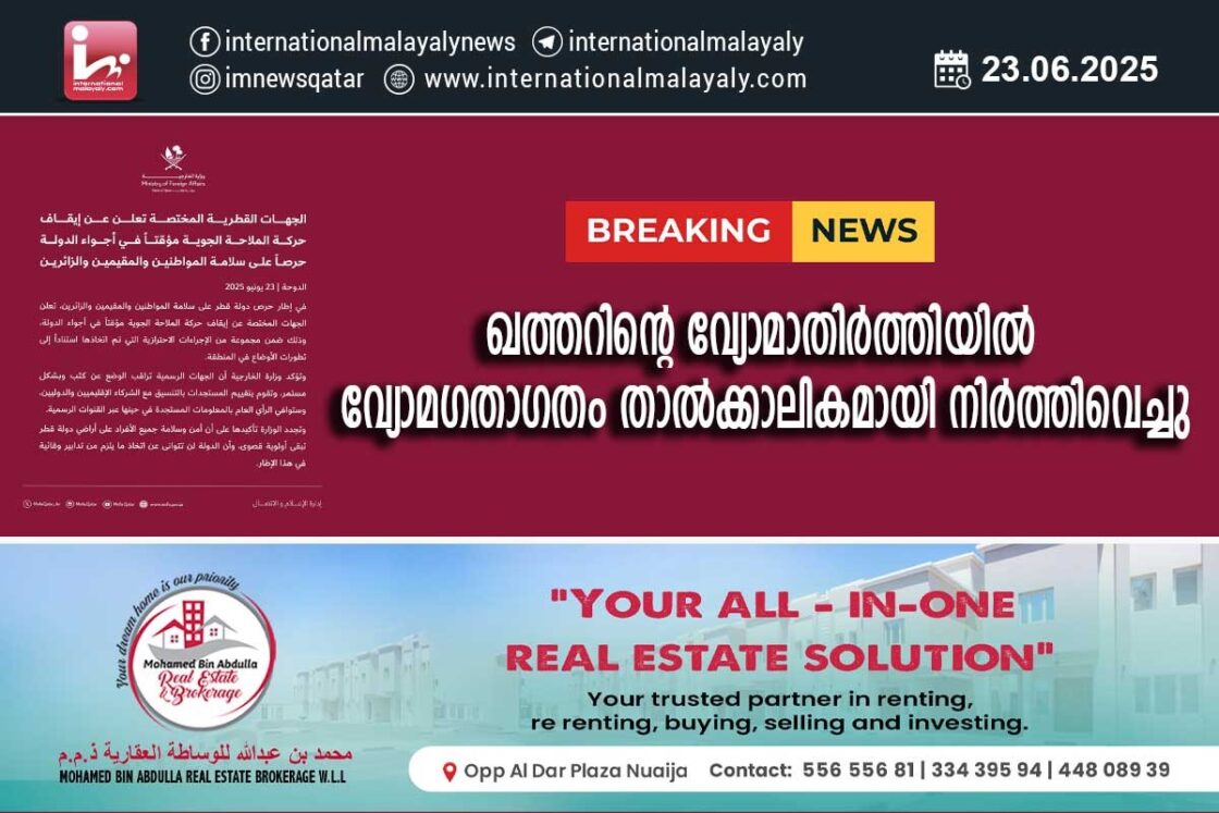 ദോഹ. മേഖലയിലെ സംഭവവികാസങ്ങളെ അടിസ്ഥാനമാക്കി സ്വീകരിച്ച മുന്കരുതല് നടപടികളുടെ ഭാഗമായി രാജ്യത്തിന്റെ വ്യോമാതിര്ത്തിയില് വ്യോമഗതാഗതം താല്ക്കാലികമായി നിര്ത്തിവച്ചതായി യോഗ്യതയുള്ള അധികാരികള് പ്രഖ്യാപിച്ചു. പൗരന്മാരുടെയും താമസക്കാരുടെയും സന്ദര്ശകരുടെയും സുരക്ഷ ഉറപ്പുവരുത്തുന്നതിനുള്ള രാജ്യത്തിന്റെ പ്രതിബദ്ധതയുടെ ഭാഗമായാണ് നടപടി.
