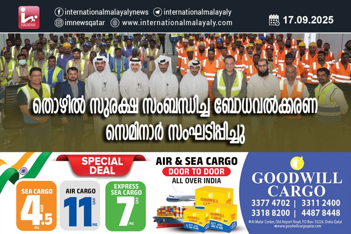 ദോഹ. തൊഴില് മന്ത്രാലയം, അഷ്ഗാലിന്റെയും വര്ക്കേഴ്സ് സപ്പോര്ട്ട് & ഇന്ഷുറന്സ് ഫണ്ടിന്റെയും സഹകരണത്തോടെ, ജോലിസ്ഥലത്തെ അപകടസാധ്യതകളെയും പ്രതിരോധത്തെയും കുറിച്ച്, സുരക്ഷ വര്ദ്ധിപ്പിക്കുന്നതിനും തൊഴിലാളികളെ സംരക്ഷിക്കുന്നതിനുമായി ബിര്കത്ത് അല് അവാമറില് ബോധവല്ക്കരണ സെമിനാര് സംഘടിപ്പിച്ചു