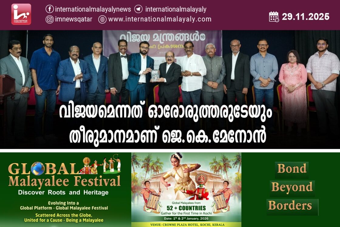 ദോഹ. ജീവിതത്തില് വിജയമെന്നത് ഓരോരുത്തരുടേയും വ്യക്തിപരമായ തീരുമാനമാണെന്നും ആ തീരുമാനമെടുത്താല് വിജയത്തിലേക്കുള്ള വാതിലുകള് തുറക്കപ്പെടുമെന്നും പ്രമുഖ സംരംഭകനും എബിഎന് കോര്പറേഷന്, ഐബിപിസി ഖത്തര് എന്നിവയുടെ ചെയര്മാനും നോര്ക്ക റൂട്സ് ഡയറക്ടറുമായ ജെ.കെ.മേനോന് അഭിപ്രായപ്പെട്ടു. പ്രവാസി മാധ്യമ പ്രവര്ത്തകനും ഗ്രന്ഥകാരനുമായ ഡോ. അമാനുല്ല വടക്കാങ്ങരയുടെ നൂറാമത് പുസ്തകമായ വിജയമന്ത്രങ്ങളുടെ പത്താം ഭാഗം ദോഹയില് പ്രകാശനം ചെയ്ത് സംസാരിക്കുകയായിരുന്നു അദ്ദേഹം.