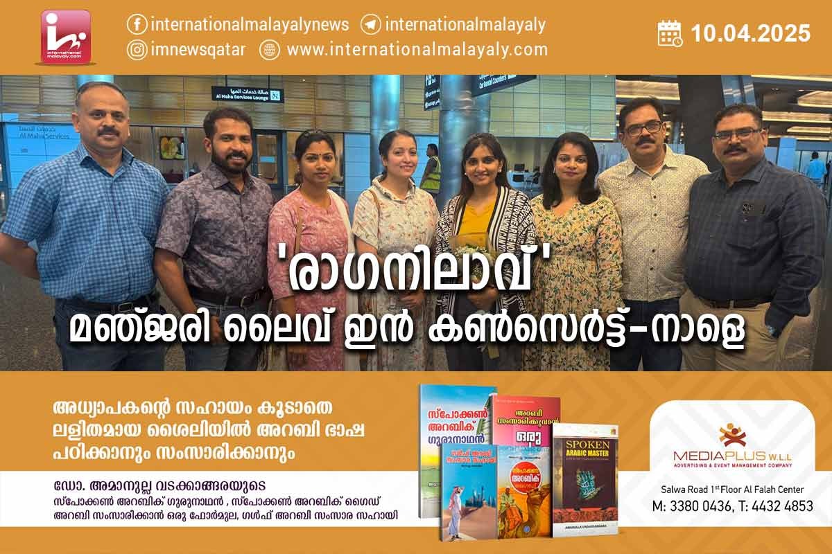 ദോഹ : നാളെ വൈകുന്നരം ക്യു എന് സി സി ഹാളില് അരങ്ങേറുന്ന കലാസന്ധ്യ ‘രാഗനിലാവ് – മഞ്ജരി ലൈവ് ഇന് കണ്സെര്ട്ട്’ ല് പങ്കെടുക്കുന്നതിനായി പ്രശസ്ത ചലച്ചിത്ര പിന്നണി ഗായിക മഞ്ജരി, ചലച്ചിത താരം അനഘ നാരായണന്, യുവ ഗായകന് അശ്വിന്, മിമിക്രി കലാകാരന് വിപിന് ബാലന് തുടങ്ങിയവര് ദോഹയില് എത്തിച്ചേര്ന്നു. കലാകാരന്മാര്ക്ക് ഹമദ് ഇന്റര്നാഷണല് എയര്പോര്ട്ടില് സംഘാടകര് ഹൃദ്യമായ സ്വീകരണമൊരുക്കി. നൃത്തവും സംഗീതവും ഹാസ്യവും ഒത്തുച്ചേരുന്ന പരിപാടി സംവിധാനം ചെയ്യുന്നത് ദോഹയിലെ പ്രശസ്ത കലാകാരന് രതീഷ് മാത്രാടനാണ്.