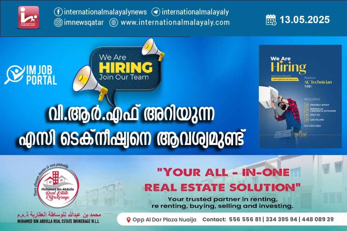 ദോഹ. ദോഹയില് വി.ആര്.എഫ് അറിയുന്ന എസി ടെക്നീഷ്യനെ ആവശ്യമുണ്ട്. താല്പര്യമുള്ളവര് [email protected] എന്ന വിലാസത്തില് സിവി അയക്കണം. കൂടുതല് വിവരങ്ങള്ക്ക് 33336821 എന്ന നമ്പറില് ബന്ധപ്പെടാം.