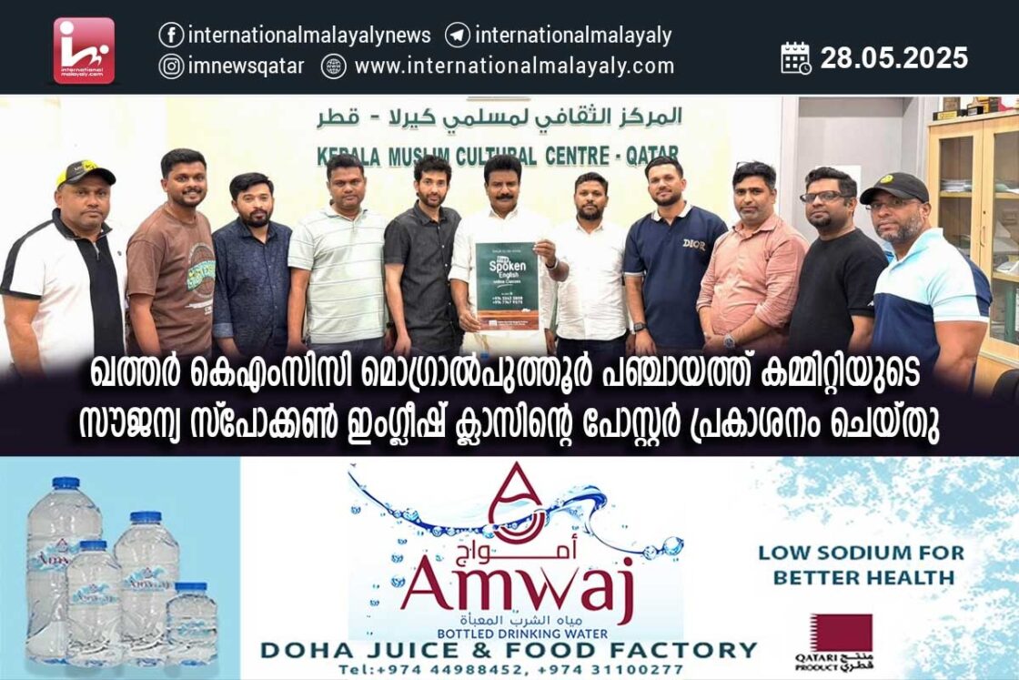 ദോഹ: ഖത്തര് കെഎംസിസി മൊഗ്രാല്പുത്തൂര് പഞ്ചായത്ത് കമ്മിറ്റിയുടെ ആഭിമുഖ്യത്തില് ‘Speak to the World’ എന്ന പേരില് സൗജന്യ സ്പോക്കണ് ഇംഗ്ലീഷ് ക്ലാസ് ആരംഭിക്കുന്നു. ക്ലാസുകളുടെ പോസ്റ്റര് പ്രകാശനം കെഎംസിസി സംസ്ഥാന ഓഫിസില് നടന്ന ചടങ്ങില് നടന്നു. കെഎംസിസി ഖത്തര് സംസ്ഥാന പ്രസിഡന്റ് ഡോ. അബ്ദുല് സമദ് ചടങ്ങ് ഉദ്ഘാടനം ചെയ്തു.