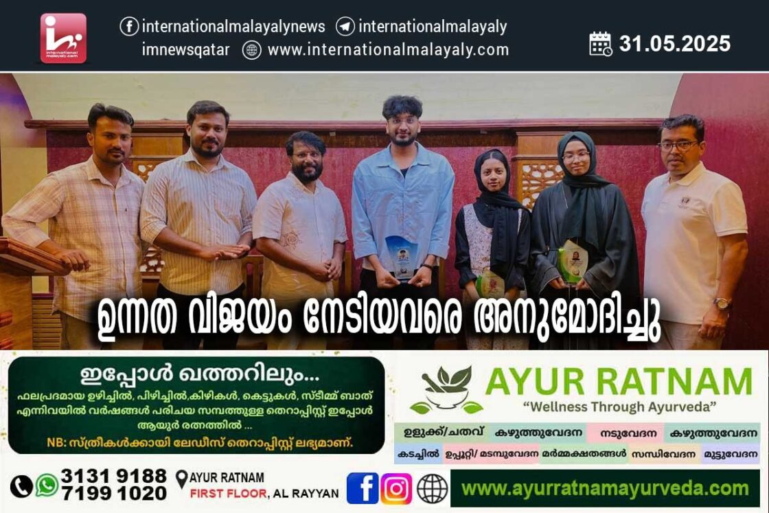 ഖത്തര് യൂണിവേഴ്സിറ്റിയില് നിന്നും ഗോള്ഡ് മെഡല് നേടിയ മിഷ്ഹല് പത്താം ക്ലാസില് ഉന്നത വിജയം കരസ്ഥ മാക്കിയ നദ ഫാത്തിമ , ഐഷ ഫാസിന് എന്നിവരെയാണ് ആദരിച്ചത്.