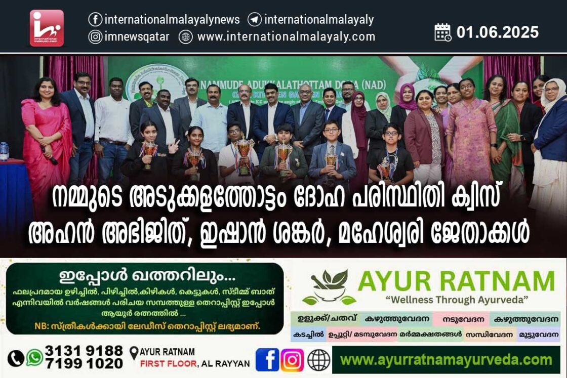 ദോഹ. നമ്മുടെ അടുക്കളത്തോട്ടം ദോഹ സംഘടിപ്പിച്ച പരിസ്ഥിതി ക്വിസില് എം.ഇ.എസ് ഇന്ത്യന് സ്കൂളിലെ അഹന് അഭിജിത് ഒന്നാം സ്ഥാനവും ഒലിവ് സ്കൂളില് നിന്നുള്ള ഇഷാന് ശങ്കര് രണ്ടാം സ്ഥാനവും ശാന്തി നികേതന് സ്കൂളിലെ മഹേശ്വരി മൂന്നാം സ്ഥാനവും നേടി.