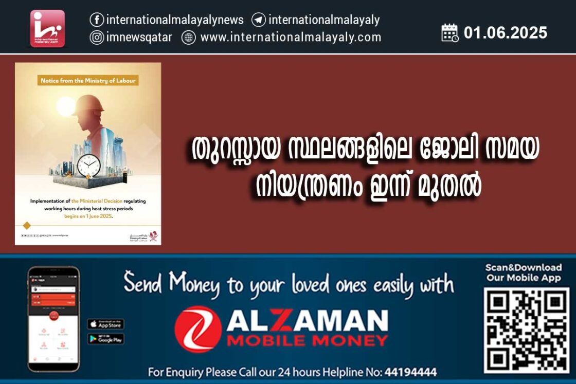 ദോഹ: വേനല് കുടുക്കുന്നതിനാല് ഖത്തറില് തുറസ്സായ സ്ഥലങ്ങളിലെ ജോലി സമയ നിയന്ത്രണം ഇന്ന് മുതല് ആരംഭിക്കുമെന്ന് തൊഴില് മന്ത്രാലയം പ്രഖ്യാപിച്ചു.