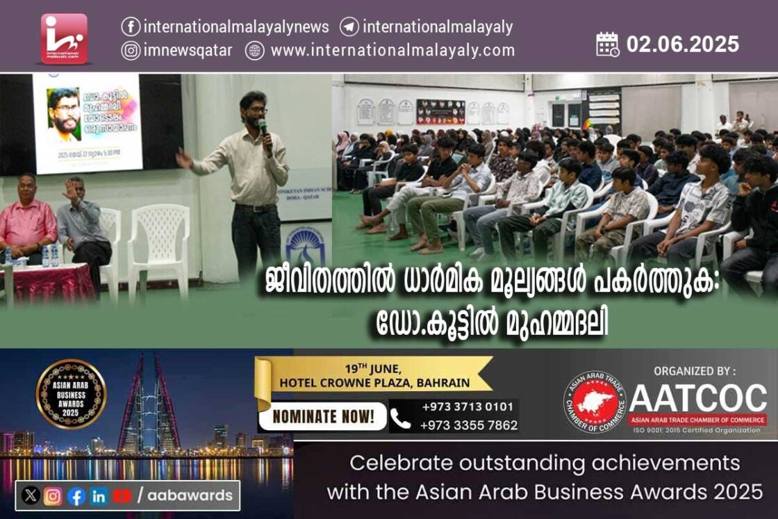 ദോഹ: ജീവിതത്തിന്റെ സര്‍വ മേഖലകളിലും മാര്‍ഗദര്‍ശനം നല്‍കുന്ന ഇസ്ലാമിന്റെ ധാര്‍മിക മൂല്യങ്ങള്‍ ജീവിതത്തില്‍ പകര്‍ത്താന്‍ വിദ്യാര്‍ത്ഥി സമൂഹം ശ്രദ്ധിക്കണമെന്ന് ജമാഅത്തെ ഇസ്ലാമി കേരള സംസ്ഥാന സമിതി അംഗവും, ഇസ് ലാമിക് പബ്ലിഷ് ഹൗസ് ഡയറക്ടറുമായ ഡോ. കൂട്ടില്‍ മുഹമ്മദലി അഭിപ്രായപ്പെട്ടു.