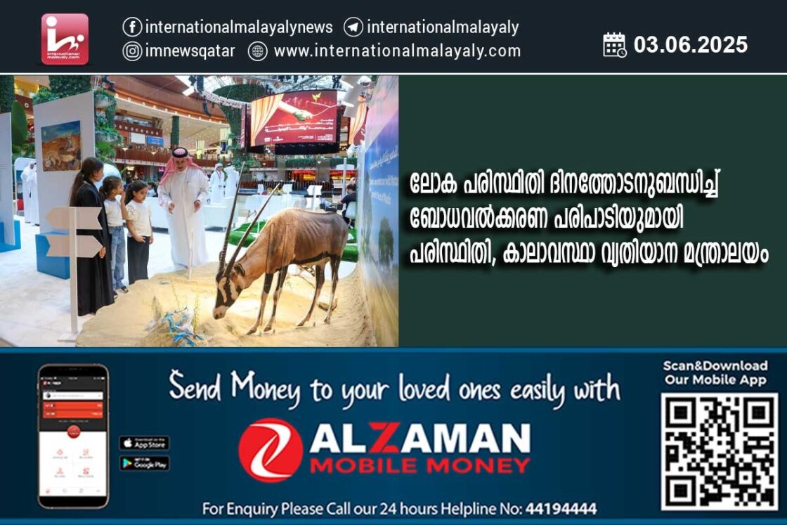 ദോഹ. ലോക പരിസ്ഥിതി ദിനത്തോടനുബന്ധിച്ച് ബോധവല്ക്കരണ പരിപാടിയുമായി പരിസ്ഥിതി, കാലാവസ്ഥാ വ്യതിയാന മന്ത്രാലയം. പ്ലാസ്റ്റിക് മലിനീകരണത്തിന്റെ അപകടങ്ങളെക്കുറിച്ച് സമൂഹത്തിലെ വിവിധ വിഭാഗങ്ങളില് അവബോധം വളര്ത്തുക എന്ന ലക്ഷ്യത്തോടെയാണ് ഖത്തര് മാളില് ഒരു അവബോധ പരിപാടി സംഘടിപ്പിക്കുന്നത്.