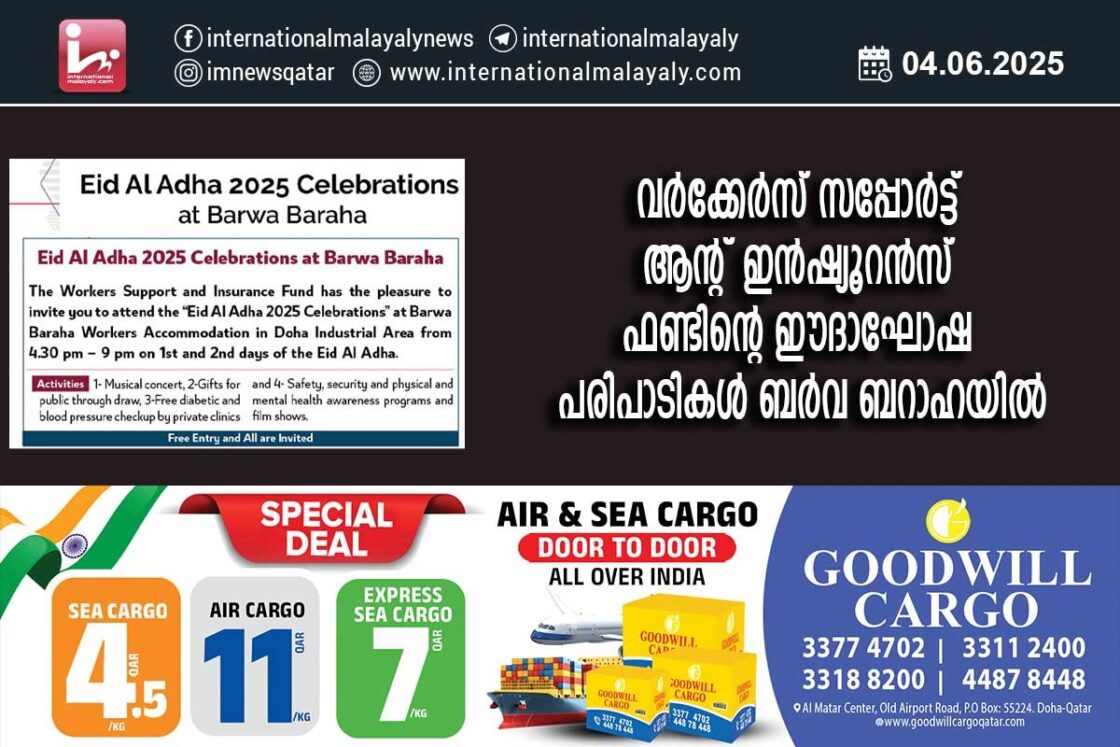 ദോഹ. വര്ക്കേര്സ് സപ്പോര്ട്ട് ആന്റ് ഇന്ഷ്യൂറന്സ് ഫണ്ടിന്റെ ഈദാഘോഷ പരിപാടികള് ഈദുല് അദ്ഹയുടെ ഒന്നും രണ്ടും ദിവസങ്ങളില് വൈകുന്നേരം 4.30 മുതല് 9 മണി വരെ ദോഹ ഇന്ഡസ്ട്രിയല് ഏരിയയിലെ ബര്വ ബറാഹയില് നടക്കും.