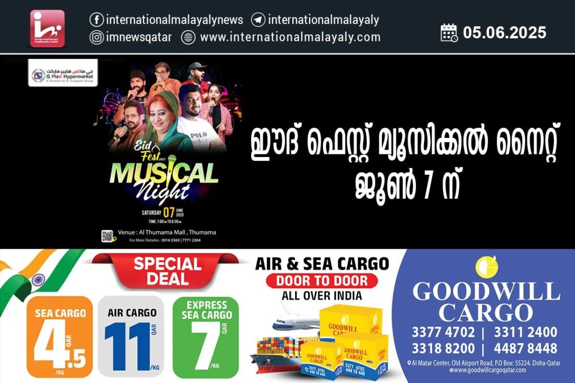 ദോഹ. ഈദുല് അദ്ഹയോടനുബന്ധിച്ച് ഖത്തറിലെ പ്രമുഖ ബിസിനസ് ഗ്രൂപ്പായ അല് സുവൈദ് ഗ്രൂപ്പിന്റെ ഭാഗമായ ജി മാക്സ് ഹൈപ്പര്മാര്ക്കറ്റ് സംഘടിപ്പിക്കുന്ന ഈദ് ഫെസ്റ്റ് മ്യൂസിക്കല് നൈറ്റ് ജൂണ് 7 ന് വൈകുന്നേരം 7 മണി മുതല് 8.30 വരെ തുമാമ മാളില് നടക്കും.
