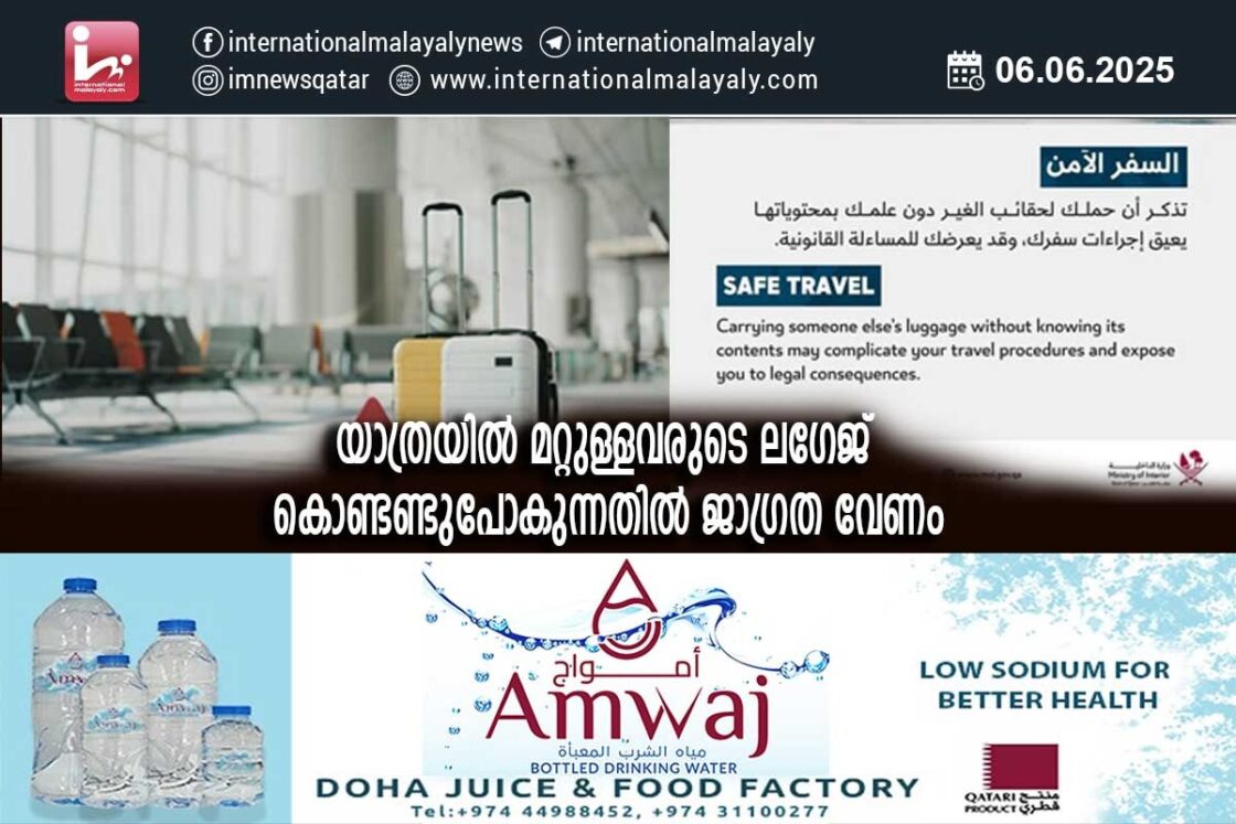 ദോഹ. യാത്രയില് മറ്റുള്ളവരുടെ ലഗേജ് കൊണ്ടുപോകുന്നതില് ജാഗ്രത വേണമെന്ന് ആഭ്യന്തര മന്ത്രാലയം. പ്രത്യേകിച്ചും ബാഗേജില് എന്താണെന്നറിയാതെ കൊണ്ടുപോകുന്നത് നിയമ പരമായ പ്രശ്നങ്ങള്ക്കും കാരണമായേക്കും.