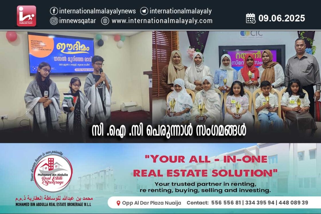 സെന്റർ ഫോർ ഇന്ത്യൻ കമ്മ്യൂണിറ്റി (സി.ഐ.സി) റയ്യാൻ സോൺ ബലി പെരുന്നാളിനോടനുബന്ധിച്ച് റയ്യാനീദ് എന്ന തലക്കെട്ടിൽ പെരുന്നാൾ നമസ്കാരത്തിന് ശേഷം ഈദ് സ്നേഹ സംഗമം സംഘടിപ്പിച്ചു. നൂറ് കണക്കിന് പ്രവർത്തകരും കുടുംബാംഗങ്ങളും പങ്കെടുത്ത പരിപാടിയിൽ മലർവാടി കുട്ടികളുടെ മാപ്പിളപ്പാട്ട് മത്സരവും, സി.ഐ.സി അംഗങ്ങളുടെ കലാപരിപാടികളും അരങ്ങേരി. സോണൽ വൈസ് പ്രസിഡന്റ് സുഹൈൽ ശാന്തപൂരം ഈദ് സന്ദേശം കൈമാറി. സെക്രട്ടറി അബ്ദുൽ ജലീൽ എം .എം സ്വാഗതം പറഞ്ഞു.