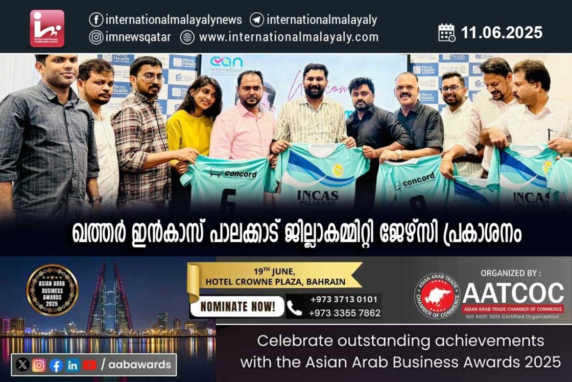 ഖത്തര് ഇന്കാസ് പാലക്കാട് ജില്ലാകമ്മിറ്റി ജേഴ്സി പ്രകാശനം