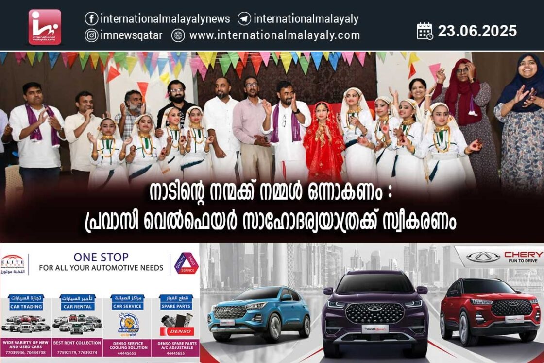 നാടിന്റെ നന്മക്ക് നമ്മള് ഒന്നാകണം : പ്രവാസി വെല്ഫെയര് സാഹോദര്യയാത്രക്ക് സ്വീകരണം