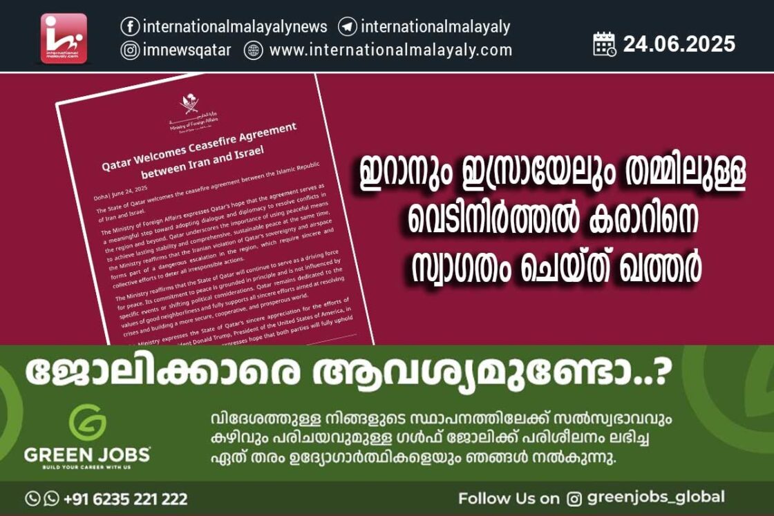 ഇറാനും ഇസ്രായേലും തമ്മിലുള്ള വെടിനിര്ത്തല് കരാറിനെ സ്വാഗതം ചെയ്ത് ഖത്തര്