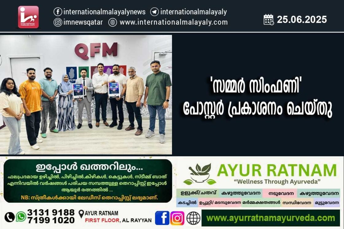 ദോഹ. പ്രവാസി വെല്ഫെയര് സാഹോദര്യ കാലത്തിന്റെ ഭാഗമായി സംഘടിപ്പിക്കുന്ന ‘സമ്മര് സിംഫണി’ സംഗീത വിരുന്നിന്റെ പോസ്റ്റര് പ്രകാശനം പരിപാടിയുടെ മുഖ്യ പ്രായോജകരായ ഓട്ടോ ഫാസ്റ്റ് ട്രാക്ക് മാനേജിംഗ് ഡയറക്ടര് ഷിയാസ് കൊട്ടാരം , റിയാദ മെഡിക്കല്സ് സെന്റര് മാര്ക്കറ്റിംഗ് ഹെഡ് അല്ത്താഫ് എന്നിവര് ചേര്ന്ന് നിര്വ്വഹിച്ചു. സംഗീത ലോകത്തെ യുവ പ്രതിഭകളായ ജാസിം ജമാല്, നിഹാരിക, മുര്ഷിദ് അഹമ്മദ് എന്നിവര് ഒരുക്കുന്ന സമ്മര് സിംഫണി ജൂണ് 26 വ്യാഴാഴ്ച വൈകീട്ട് 7 മണിക്ക് അബൂഹമൂറിലെ ഐ.സി.സി അശോക ഹാളില് നടക്കും. പ്രവേശനം സൗജന്യമാണ്.
