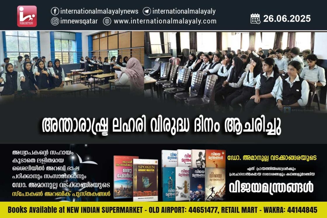 ദോഹ. ഖത്തര് പ്രവാസികളുടെ പങ്കാളിത്തത്തോടെ വിജയകരമായി നടക്കുവന്ന ആസ്പയര് കോളേജ് തൃത്താലയിലെ എന്എസ്എസ് യൂണിറ്റിന്റെയും, ആന്റി നര്കോട്ടിക്ക് സെല്ലിന്റെയും നേതൃത്വത്തില് ലഹരി വിരുദ്ധ ദിനം ആചരിച്ചു. പരിപാടിയുടെ ഭാഗമായി കോളേജിലെ വിദ്യാര്ത്ഥികളും അധ്യാപകരും അനധ്യാപകരും ലഹരി വിരുദ്ധ പ്രതിജ്ഞ എടുക്കുകയും തുടര്ന്ന് കോളേജിലെ വിദ്യാര്ത്ഥികളെ പങ്കെടുപ്പിച്ചുകൊണ്ട് ക്വിസ് മത്സരം സംഘടിപ്പിക്കുകയും ചെയ്തു.