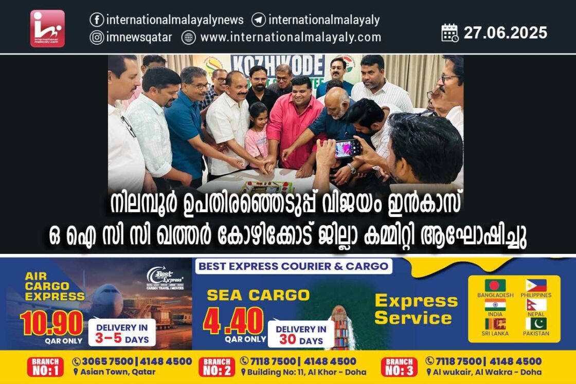 നിലമ്പൂര് ഉപതിരഞ്ഞെടുപ്പ് വിജയം ഇന്കാസ് -ഒ ഐ സി സി ഖത്തര് കോഴിക്കോട് ജില്ലാ കമ്മിറ്റി ആഘോഷിച്ചു