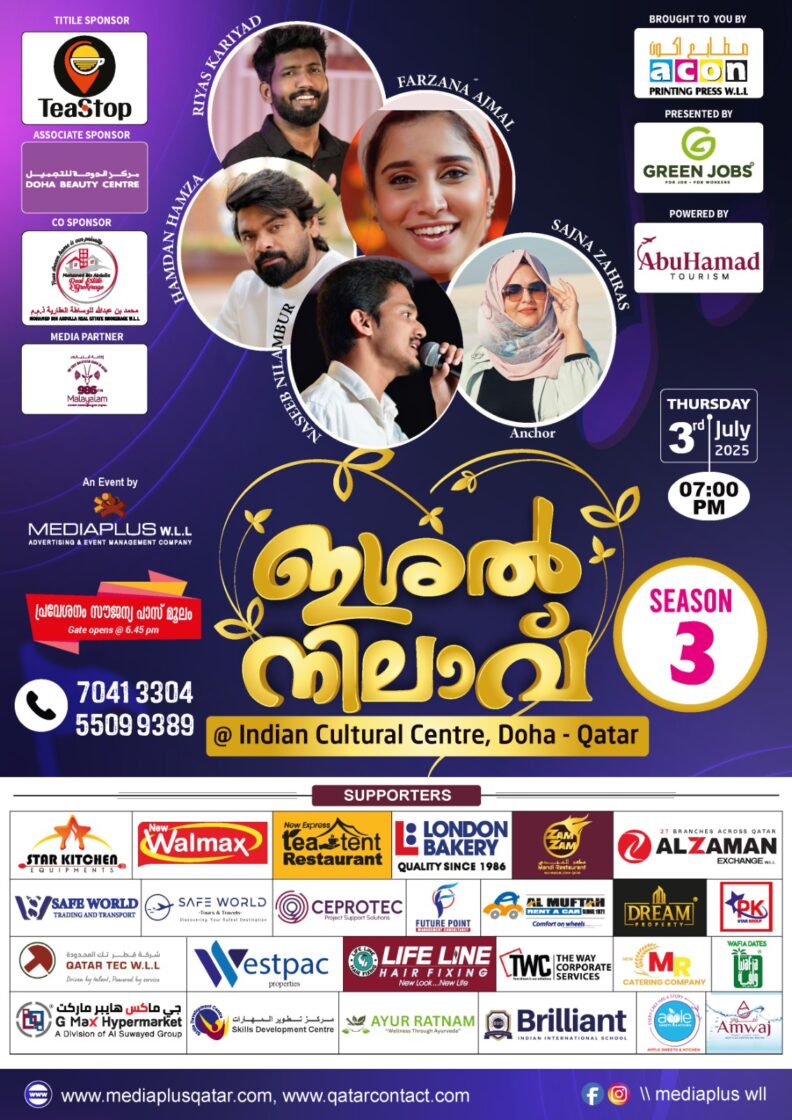ദോഹ. തനത് മാപ്പിളപ്പാട്ടുകള് കോര്ത്തിണക്കി മീഡിയ പ്ളസ് അണിയിച്ചൊരുക്കുന്ന ടീ സ്റ്റോപ്പ് ഇശല് നിലാവ് സീസണ് 3 ജൂലൈ 3 ന് ഐസിസി അശോക ഹാളില് നടക്കും.