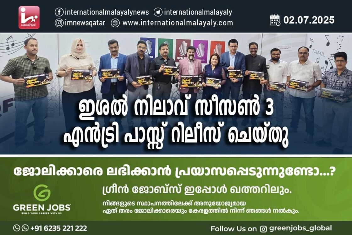 ദോഹ. തനത് മാപ്പിളപ്പാട്ടുകള് കോര്ത്തിണക്കി മീഡിയ പ്ളസ് അണിയിച്ചൊരുക്കുന്ന ഇശല് നിലാവ് സീസണ് 3 എന്ട്രി പാസ്സ് റിലീസ് ചെയ്തു.റേഡിയോ മലയാളം സ്റ്റുഡിയോവില് നടന്ന ചടങ്ങില് അക്കോണ് പ്രിന്റിംഗ് പ്രസ്സ് ഡയറക്ടറും ജനറല് മാനേജറുമായ പിടി മൊയ്തീന് കുട്ടി, ദോഹ ബ്യൂട്ടി സെന്റര് മാനേജിംഗ് ഡയറക്ടര് ഡോ.ഷീല ഫിലിപ്പോസ്, ഗ്രീന് ജോബ്സ് മാനേജിംഗ് ഡയറക്ടര് ഷാനു, റേഡിയോ മലയാളം സിഇഒ അന്വര് ഹുസൈന്, മീഡിയ പ്ളസ് സിഇഒ ഡോ.അമാനുല്ല വടക്കാങ്ങര, അബൂ ഹമദ് ടൂറിസം സിഇഒ റസ്സല് അഹ് മദ്, സെപ്രോടെക് സിഇഒ ജോസ് ഫിലിപ്പ്, ഖത്തര് ടെക് മാനേജിംഗ് ഡയറക്ടര് ജെബി കെ ജോണ്, സോഷ്യല് മീഡിയ ഇന്ഫ്ളുവന്സര് സജ്ന സഹ്റാസ് , ന്യൂ വാല്മാക്സ് പ്രതിനിധി ഫിറോസ് ബാബു എന്നിവര് ചേര്ന്നാണ് എന്ട്രി പാസ്സ് റിലീസ് ചെയ്തത്.