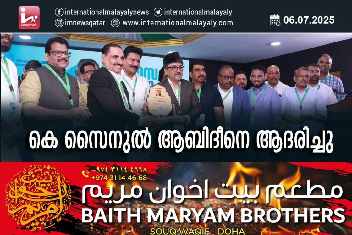 ദോഹ. മുസ്ലിം ലീഗ് ദേശീയ വൈസ് പ്രസിഡണ്ടായി തെരെഞ്ഞെടുക്കപ്പെട്ട കെ സൈനുല് ആബിദീനെ ആദരിച്ചു. ഐസിസി അശോക ഹാളില് ഖത്തര് കെഎംസിസി സീനിയര് വൈസ് പ്രസിഡണ്ടും കലാ – കായിക – ജീവ കാരുണ്യ മേഖലകളിലെ സജീവ സാന്നിധ്യവുമായിരുന്ന കെ മുഹമ്മദ് ഈസയുടെ ഓര്മ്മക്കായി കെഎംസിസി മലപ്പുറം ജില്ലാ കമ്മിറ്റിയുടെ നേതൃത്വത്തില് നിര്മ്മിക്കുന്ന ചാരിറ്റി ടവര് പ്രഖ്യാപനം സമ്മേള നത്തില് വെച്ചാണ് സൈനുല് ആബിദീനെ ആദരിച്ചത്. ഖത്തര് കെ.എം.സി.സി മുതിര്ന്ന നേതാക്കളുടെ സാന്നിധ്യത്തില് മുസ് ലിം ലീഗ് സംസ്ഥാന പ്രസിഡണ്ട് പാണക്കാട് സയ്യിദ് സാദിഖലി ശിഹാബ് തങ്ങള് മെമന്റോ സമ്മാനിച്ചു.