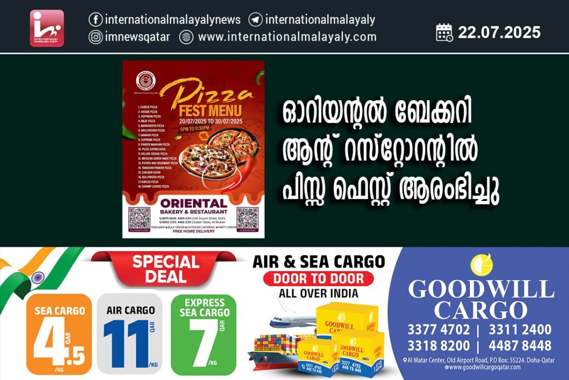 ദോഹ. ഖത്തറില് ഗുണ നിലവാരമുള്ള ഭക്ഷ്യ വിഭവങ്ങള്ക്ക് പേരുകേട്ട ഓറിയന്റല് ബേക്കറി ആന്റ് റസ്റ്റോറന്റില് പിസ്സ ഫെസ്റ്റ് ആരംഭിച്ചു. ജൂലൈ 30 വരെ വൈകുന്നേരം 5 മണി മുതല് രാത്രി 11.30 വരെയാണ് ഫെസ്റ്റ് .