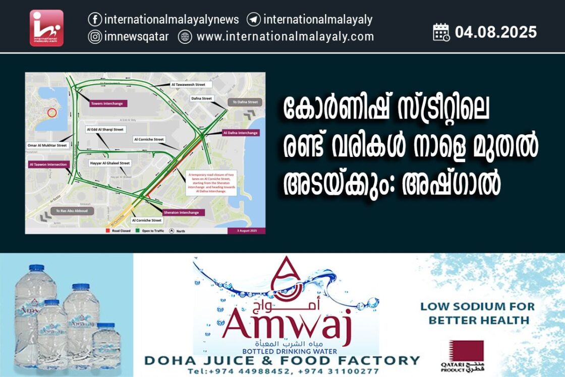 ദോഹ: നാളെ മുതല് അല് കോര്ണിഷ് സ്ട്രീറ്റിലെ രണ്ട് വരി പാതകള് താല്ക്കാലികമായി അടക്കുമെന്ന് പൊതുമരാമത്ത് അതോറിറ്റി (അഷ്ഗാല്) അറിയിച്ചു.