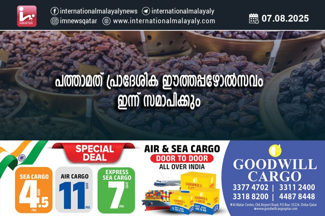 ദോഹ. സൂഖ് വാഖിഫില് നടന്നുവരുന്ന പത്താമത് പ്രാദേശിക ഈത്തപ്പഴോല്സവം ഇന്ന് സമാപിക്കും. രാജ്യത്തെ 114 ഫാമുകളുടെ സഹകരണത്തോടെ നടക്കുന്ന ഈത്തപ്പഴോല്സവം മികച്ച പ്രതികരണമാണ് സൃഷ്ടിച്ചത്. എണ്പതിനായിരത്തോളം സന്ദര്ശകരെത്തിയ മേളയില് ഇതിനകം തന്നെ ഒന്നര ലക്ഷം കിലോയിലധികം വിവിധയിനം ഈത്തപ്പഴങ്ങളാണ് വില്പനയായത്.