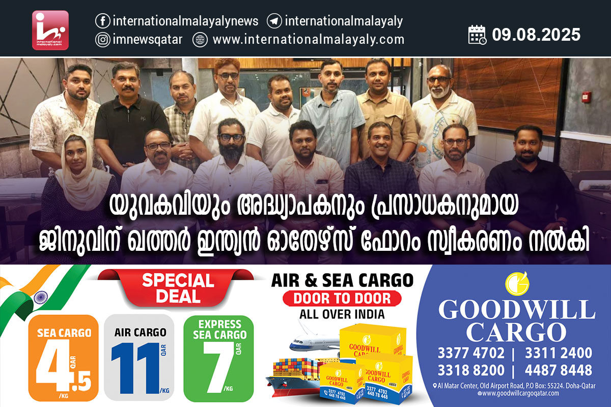ദോഹ. ഹ്രസ്വ സന്ദര്ശനാര്ത്ഥം ഖത്തറിലെത്തിയ യുവകവിയും അദ്ധ്യാപകനും പ്രസാധകനുമായ ജിനുവിന് ഖത്തര് ഇന്ത്യന് ഓതേഴ്സ് ഫോറം സ്വീകരണം നല്കി.