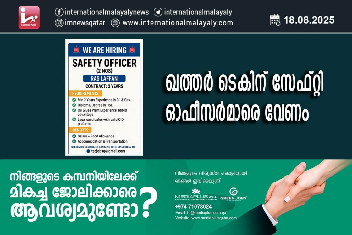 ഖത്തര് ടെകിന് സേഫ്റ്റി ഓഫീസര്മാരെ വേണം