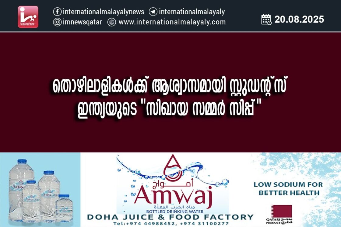 ദോഹ: സഫാരി ഗ്രൂപ്പിന്റെ സഹകരണത്തോടെ സ്റ്റുഡന്റ്സ് ഇന്ത്യ ഖത്തര് ”സിഖായ സമ്മര് സിപ്പ്” വിജയകരമായി സംഘടിപ്പിച്ചു. ഖത്തറിലെ കടുത്ത വേനല്ക്കാലത്ത് പുറത്ത് ജോലിയെടുക്കുന്ന തൊഴിലാളികള്ക്ക് ആശ്വാസം പകരുന്നതോടൊപ്പം വിദ്യാര്ത്ഥികളില് സാമൂഹ്യ പ്രതിബദ്ധതയും സേവനമനോഭാവവും വളര്ത്തിയെടുക്കുക എന്ന ലക്ഷ്യത്തോടെ എല്ലാ വര്ഷവും സ്റ്റുഡന്റ്സ് ഇന്ത്യ ‘സിഖായ’ സംഘടിപ്പിക്കാറുണ്ട്.