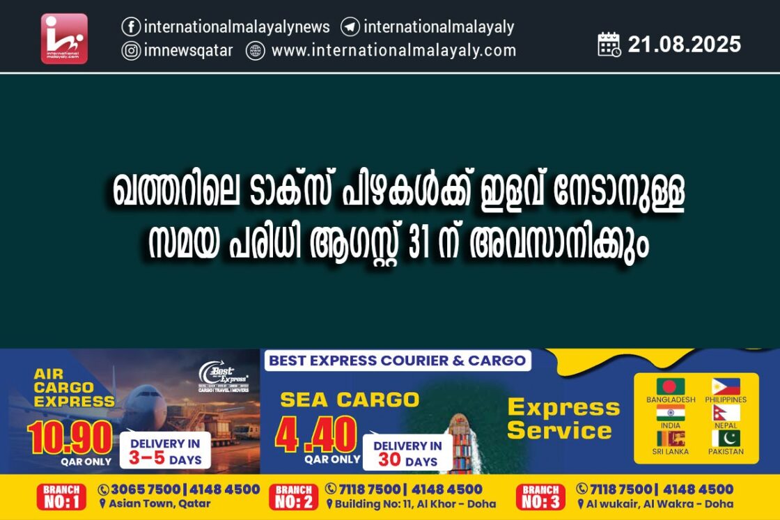 ഖത്തറിലെ ടാക്സ് പിഴകള്ക്ക് ഇളവ് നേടാനുള്ള സമയ പരിധി ആഗസ്റ്റ് 31 ന് അവസാനിക്കും