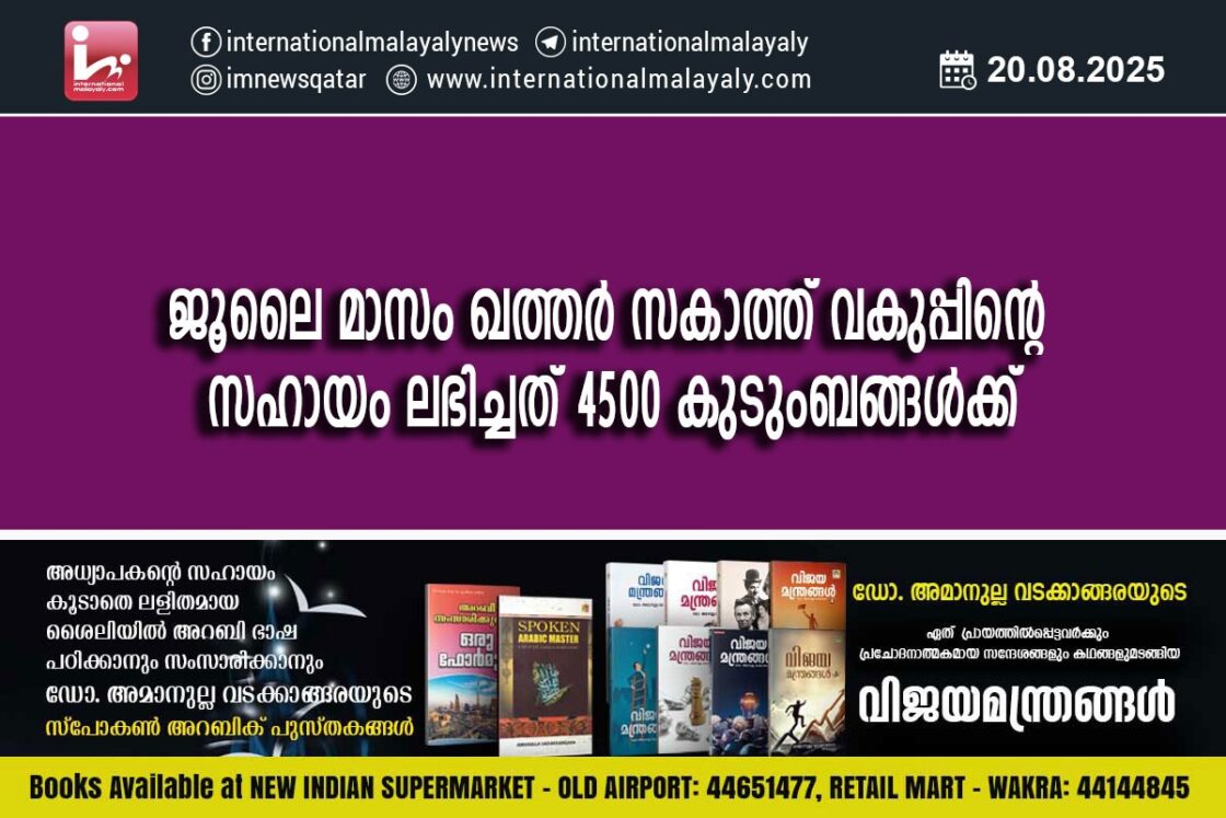 ജൂലൈ മാസം ഖത്തര് സകാത്ത് വകുപ്പിന്റെ സഹായം ലഭിച്ചത് 4500 കുടുംബങ്ങള്ക്ക്