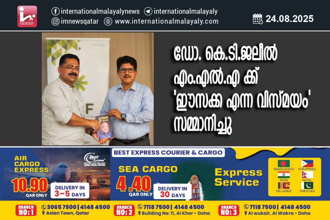 ദോഹ. ഹ്രസ്വ സന്ദര്ശനാര്ഥം ദോഹിലെത്തിയ മുന് കേരള ഉന്നത വിദ്യാഭ്യാസ മന്ത്രി ഡോ. കെ.ടി.ജലീല് എം.എല്.എ ക്ക് ‘ഈസക്ക എന്ന വിസ്മയം’ സമ്മാനിച്ചു