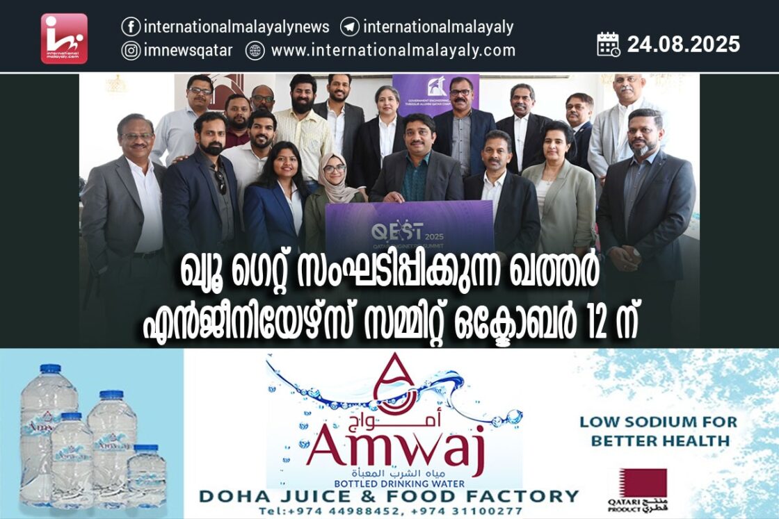 ദോഹ. തൃശൂര് ഗവണ്മെന്റ് എന്ജിനിയറിംഗ് കോളേജിന്റെ ഖത്തറിലെ പൂര്വ്വ വിദ്യാര്ത്ഥി സംഘടനയായ ഖ്യൂ ഗെറ്റ് സംഘടിപ്പിക്കുന്ന ഖത്തര് എന്ജീനിയേഴ്സ് സമ്മിറ്റ് ഒക്ടോബര് 12 ന്, വെസ്റ്റ് ബേയിലുള്ള ഹോട്ടല് പുള്മാനില് നടക്കും.