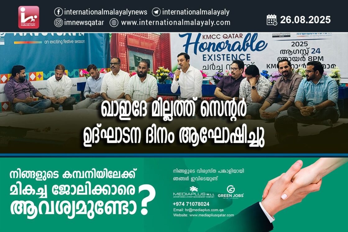 ദോഹ: ഇന്ത്യന്‍ യൂണിയന്‍ മുസ് ലിം ലീഗ് ദേശീയ കമ്മിറ്റി ആസ്ഥാനമായി ഡല്‍ഹിയില്‍ പുതുതായി യാഥാര്‍ഥ്യമാക്കിയ ഖാഇദേ മില്ലത്ത് സെന്റര്‍ ഉത്ഘാടന ദിന സന്തോഷത്തില്‍ കെഎംസിസി ഖത്തര്‍ ആഹ്ലാദ സദസ്സ് സംഘടിപ്പിച്ചു. രാജ്യ തലസ്ഥാനത്ത് അഭിമാനകരമായ അസ്തിത്വത്തിന്റെ സന്ദേശമുയര്‍ത്തി വിവിധ സൗകര്യങ്ങളോടെ സ്ഥാപിതമായ ബഹുനില സമുച്ചയമാണ് ഖാഇദേ മില്ലത്ത് സെന്റര്‍. മുസ് ലിം ദേശീയ കമ്മിറ്റി ഓഫിസ്, സ്റ്റുഡന്റ്‌സ് സെന്റര്‍, മീറ്റിങ് ഹാള്‍, ഓഡിറ്റോറിയം തുടങ്ങിയ ആധുനിക സൗകര്യങ്ങളാണ് ഓഫീസില്‍ സജ്ജീകരിച്ചിട്ടുള്ളത്. സാമുദായിക പുരോഗതിക്ക് ആവശ്യമായ സമുച്ചയം യാഥാര്‍ഥ്യമാക്കിയ ദേശീയ മുസ്ലിം ലീഗ് നേതാക്കളെ കെഎംസിസി ഖത്തര്‍ സംസ്ഥാന കമ്മിറ്റി അഭിനന്ദിച്ചു. സൗധം യാഥാര്‍ഥ്യമാക്കുന്നതിന് വിഭവ സമാഹരണത്തില്‍ കെഎംസിസി ഖത്തര്‍ അഭിമാനകരമായ പങ്കാളിത്തം വഹിച്ചത് അനുസ്മരിച്ചു. സഹകരിച്ച വിവിധ ഘടകങ്ങള്‍ക്ക് നന്ദി അറിയിച്ചു.