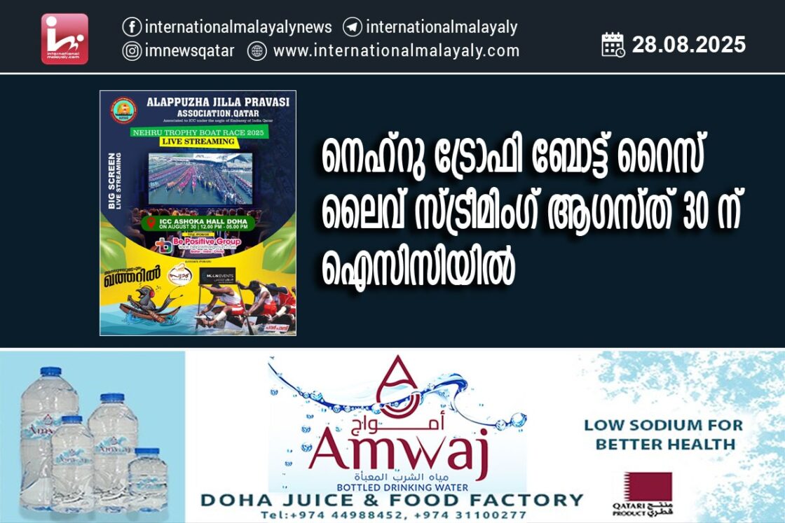 ദോഹ. നെഹ്റു ട്രോഫി ബോട്ട് റൈസ് ലൈവ് സ്ട്രീമിംഗ് ആഗസ്ത് 30 ന് ഉച്ചക്ക് 12 മണി മുതല് വൈകുന്നേരം 5 മണിവരെ ഐസിസി അശോക ഹാളില് നടക്കും. ആലപ്പുഴ ജില്ല പ്രവാസി അസോസിയേഷന് ഖത്തറാണ് പരിപാടി സംഘടിപ്പിക്കുന്നത്.