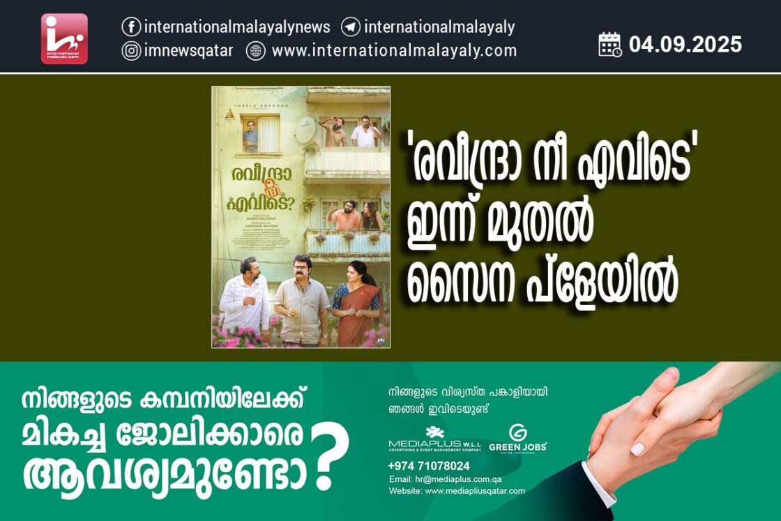 ദോഹ. മനോജ് പാലോടന് സംവിധാനം ചെയ്ത രവീന്ദ്രാ നീ എവിടെ ഇന്ന് മുതല് സൈന പ്ളേയില് കാണാം. കളിയും ചിരിയും തമാശകളും സമന്വയിപ്പിക്കുന്ന കുടുംബചിചത്രമാണിത്. ചിത്രം കാണുവാന് സൈന പ്ളേ ആപ് ഡൗണ്ലോഡ് ചെയ്യണം.