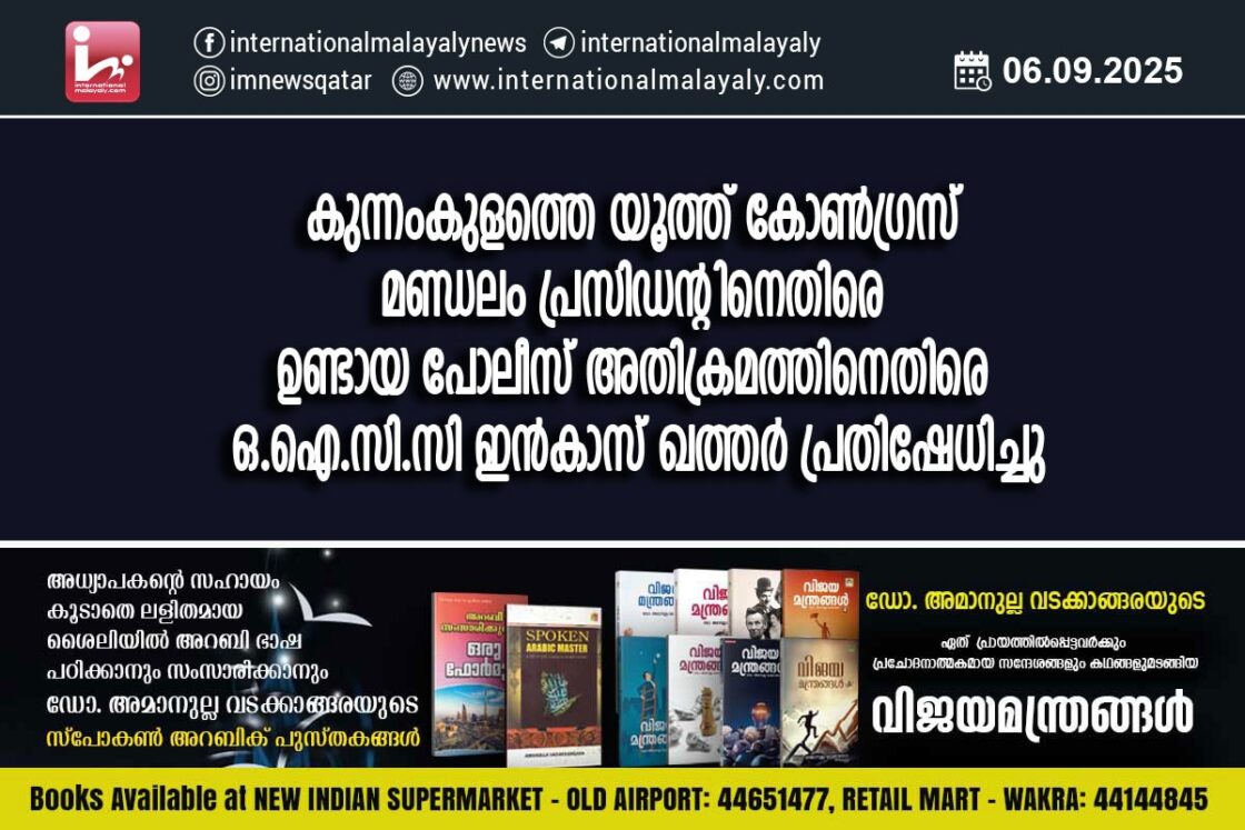 കുന്നംകുളത്തെ യൂത്ത് കോണ്ഗ്രസ് മണ്ഡലം പ്രസിഡന്റിനെതിരെ ഉണ്ടായ പോലീസ് അതിക്രമത്തിനെതിരെ ഒ.ഐ.സി.സി ഇന്കാസ് ഖത്തര് പ്രതിഷേധിച്ചു