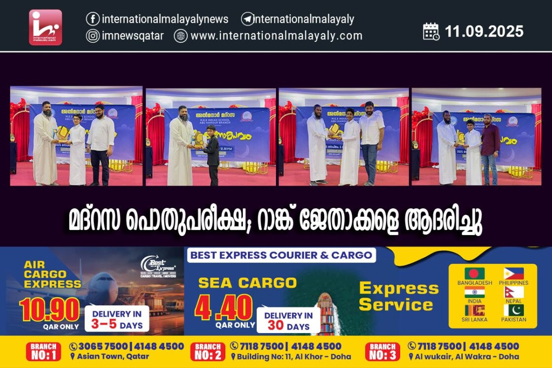ദോഹ: വിസ്ഡം എഡ്യൂക്കേഷന് ബോര്ഡിന് കീഴില് ജി.സി.സി തലത്തില് അഞ്ചു എട്ടു ക്ളാസ്സുകള്ക്കായി നടത്തിയ പൊതുപരീക്ഷയില് റാങ്ക് ജേതാക്കളായ അല്മനാര് മദ്റസ വിദ്യാര്ത്ഥികളെ ആദരിച്ചു.