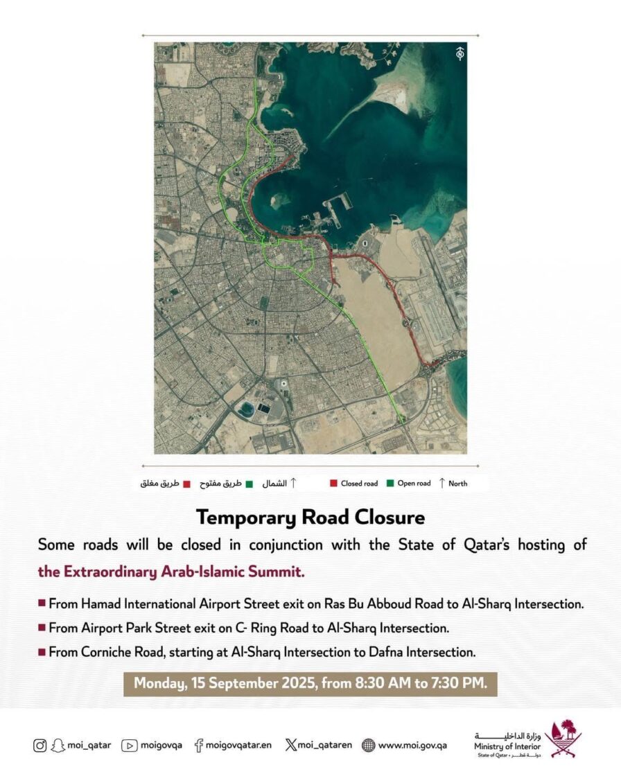 ദോഹ. ഖത്തര് തലസ്ഥാനമായ ദോഹയില് ഇന്ന് ഉച്ച കഴിഞ്ഞ് 3 മണി മുതല് നടക്കുന്ന അടിയന്തിര അറബ് ഇസ് ലാമിക ഉച്ചകോടിയുടെ പശ്ചാത്തലത്തില് ചില ഭാഗങ്ങളില് ഗതാഗത നിയന്ത്രണമേര്പ്പെടുത്തുമെന്ന് ആഭ്യന്തര മന്ത്രാലയം അറിയിച്ചു.