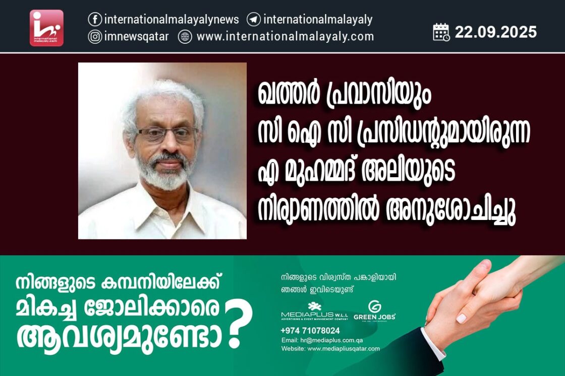 ഖത്തര് പ്രവാസിയും സി ഐ സി പ്രസിഡന്റുമായിരുന്ന എ മുഹമ്മദ് അലിയുടെ നിര്യാണത്തില് അനുശോചിച്ചു