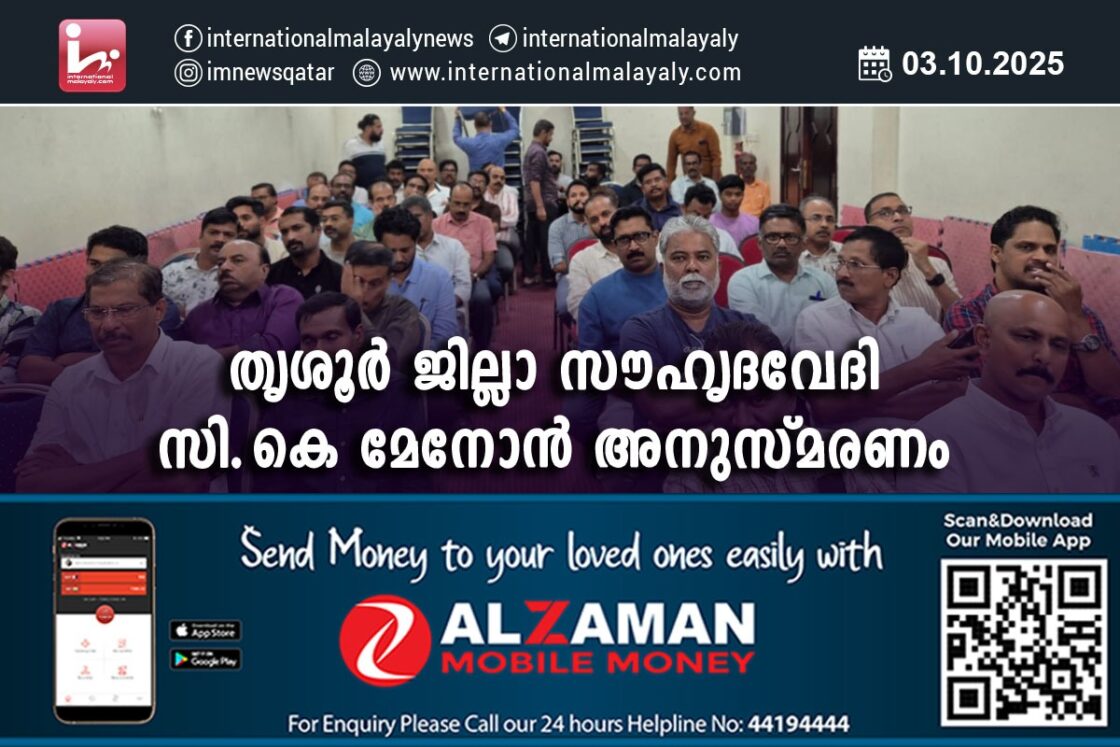 ദോഹ. ജാതി മത വര്ഗ്ഗ വര്ണ്ണ രാഷ്ട്രീയ വ്യത്യാസമന്യേ തൃശൂര് ജില്ലക്കാരുടെ കൂട്ടായ്മയായ തൃശൂര് ജില്ലാ സൗഹൃദവേദിയുടെ തുടക്കം മുതല് എക്കാലത്തേയും മുഖ്യരക്ഷാധികാരിയായ ദോഹയിലെ പ്രമുഖ വ്യവസായിയും, നോര്ക്ക റൂട്ട്സ് ഡയറക്ടറുമായിരുന്ന അഡ്വക്കേറ്റ് പത്മശ്രീ സി.കെ മേനോന്റെ ആറാമത് വാര്ഷിക അനുസ്മരണ ദിനംടാക് ഖത്തര് ഹാളില് നടന്നു.