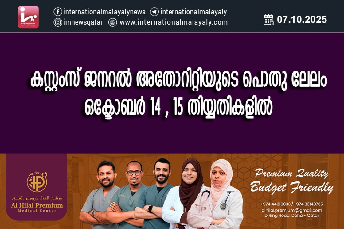 കസ്റ്റംസ് ജനറല് അതോറിറ്റിയുടെ പൊതു ലേലം ഒക്ടോബര് 14 , 15 തിയ്യതികളില്