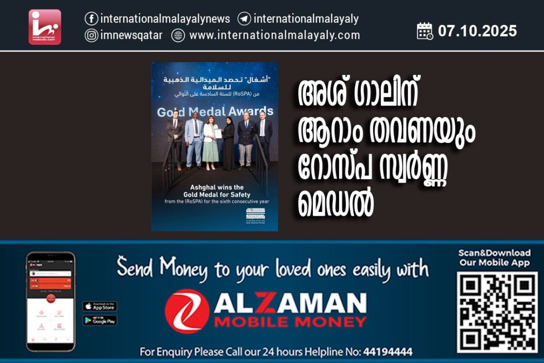 ദോഹ. റോയല് സൊസൈറ്റി ഫോര് ദി പ്രിവന്ഷന് ഓഫ് ആക്സിഡന്റ്സില് നിന്ന് സുരക്ഷയ്ക്കുള്ള റോസ്പ സ്വര്ണ്ണ മെഡല് തുടര്ച്ചയായി ആറാം വര്ഷവും അശ്ഗാല് സ്വന്തമാക്കി