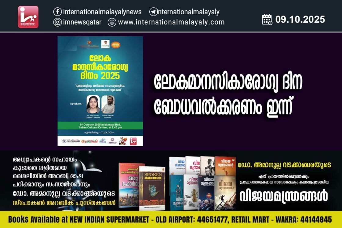 ദോഹ. ലോകമാനസികാരോഗ്യ ദിനാചരണത്തിന്റെ ഭാഗമായി മീഡിയ പ്ളസ് നീരജ് ഫൗണ്ടേഷനുമായി സഹകരിച്ച് സംഘടിപ്പിക്കുന്ന ബോധവല്ക്കരണ പരിപാടി ഇന്ന് വൈകുന്നേരം 7.45 ന് ഐസിസി മുമ്പൈ ഹാളില് നടക്കും. ദുരന്തങ്ങളിലും അടിയന്തിര സാഹചര്യങ്ങളിലും മാനസികാരോഗ്യ’ സേവനങ്ങള് ലഭ്യമാക്കല് എന്നതാണ് ഈ വര്ഷത്തെ പ്രമേയം. കൗണ്സിലറായ ജോളി തോമസ്, ഫ്രണ്ട്സ് കള്ചറല് സെന്റര് എക്സിക്യൂട്ടീവ് ഡയറക്ടര് ഹബീബുറഹ്മാന് കിഴിശ്ശേരി എന്നിവര് സംസാരിക്കും.