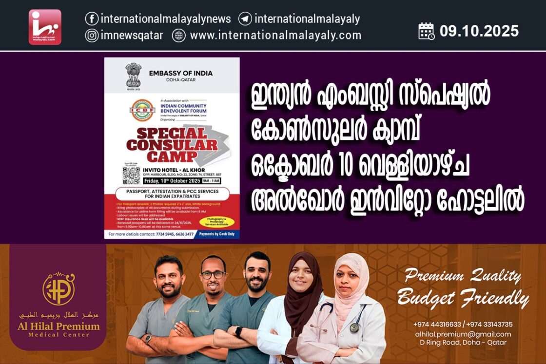 ഇന്ത്യന് എംബസ്സി സ്പെഷ്യല് കോണ്സുലര് ക്യാമ്പ് ഒക്ടോബര് 10 വെള്ളിയാഴ്ച അല്ഖോര് ഇന്വിറ്റോ ഹോട്ടലില്