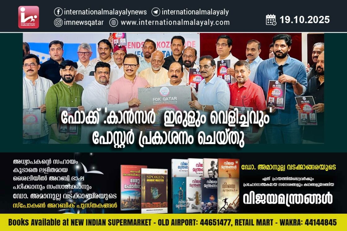 ദോഹ. സാമൂഹിക പ്രസക്തിയുള്ള വിഷയങ്ങളെ പറ്റി ഫ്രണ്ട്സ് ഓഫ് കോഴിക്കോട് സംഘടിപ്പിച്ചു വരുന്ന സെമിനാറിന്റെ ഭാഗമായി അടുത്ത വിഷയമായ ‘ കാന്സര് ‘ ഇരുളും വെളിച്ചവും എന്ന പരിപാടിയുടെ പോസ്റ്റര് പ്രകാശനം ദോഹയിലെ രാഷ്ട്രീയ സാമൂഹിക സാംസ്കാരിക രംഗത്തെ പ്രമുഖരുടെ സാന്നിദ്ധ്യത്തില് വെച്ച് അപെക്സ് ബോഡി പ്രസിഡണ്ടുമാരായ എ.പി. മണികണ്ഠന്, ഇ.പി. അബ്ദുറഹിമാന്, താഹ മുഹമ്മദ് എന്നിവര് ചേര്ന്ന് നിര്വ്വഹിച്ചു.