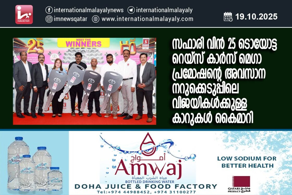 ദോഹ. ഖത്തറിലെ പ്രമുഖ ഹൈപ്പര്മാര്ക്കറ്റ് ശൃംഖലയായ സഫാരി ഹൈപ്പര്മാര്ക്കറ്റിന്റെ മെഗാ പ്രമോഷനായ വിന് 25 ടൊയോട്ട റെയ്സ് കാര്സ് പ്രമോഷന്റെ ആറാമത്തെയും അവസാനത്തെയും നറുക്കെടുപ്പ് വിജയികള്ക്കുള്ള സമ്മാനങ്ങള് കൈമാറി. ഒക്ടോബര് 15 ന് സഫാരി മാളില് വെച്ചു നടന്ന ചടങ്ങില് സഫാരി മാനേജ്മെന്റ് പ്രതിനിധികളാണ് സമ്മാനര്ഹര്ക്കുള്ള കാറുകള് കൈമാറിയത്.