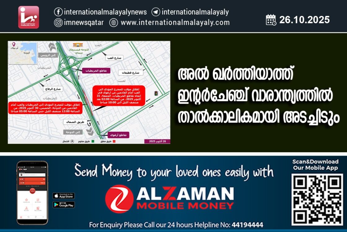 ദോഹ: അല് ഖര്ത്തിയാത്ത് ഇന്റര്ചേഞ്ച് വാരാന്ത്യത്തില് താല്ക്കാലികമായി അടച്ചിടുമെന്ന് പൊതുമരാമത്ത് അതോറിറ്റിയായ അഷ്ഗാല് അറിയിച്ചു.
