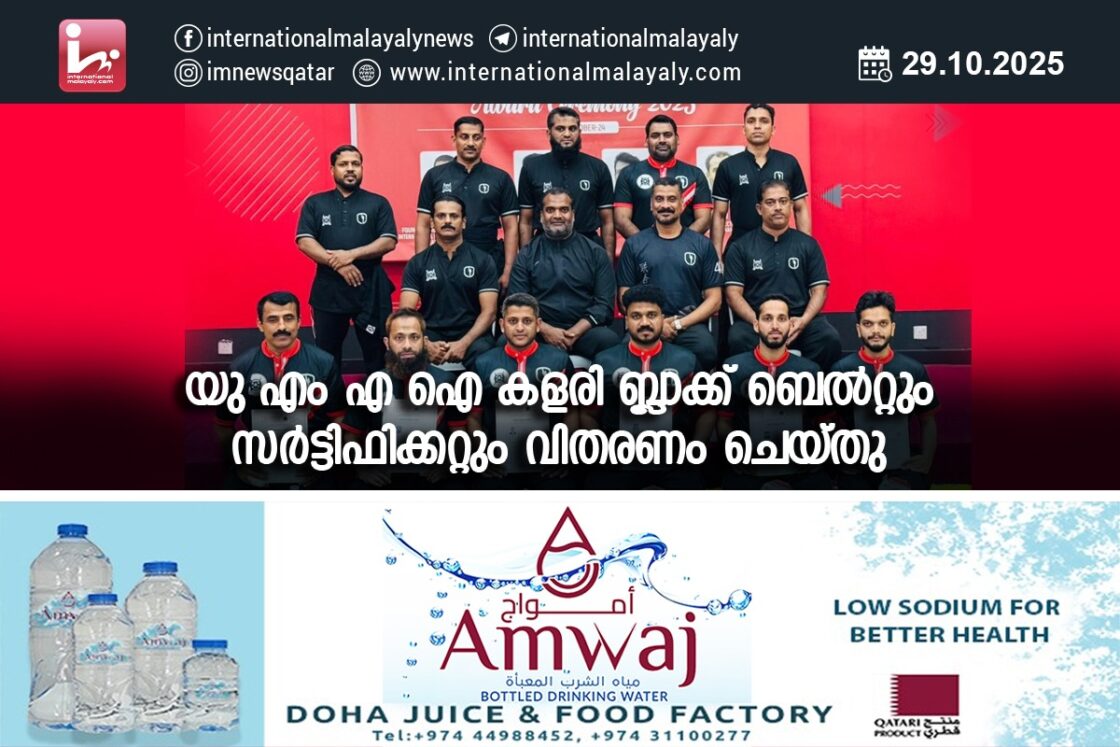ദോഹ. യുണൈറ്റഡ് മാര്‍ഷ്യല്‍ ആര്‍ട്‌സ് അക്കാദമി ഇന്റര്‍നാഷണല്‍ ദോഹയില്‍ വെച്ച് കളരിപ്പയറ്റ് ബ്ലാക്ക് ബെല്‍റ്റ് ഗ്രേഡിംഗ് ടെസ്റ്റില്‍ പങ്കെടുത്തവര്‍ക്ക് ബ്ലാക്ക് ബെല്‍റ്റും സര്‍ട്ടിഫിക്കറ്റും വിതരണം ചെയ്തു.